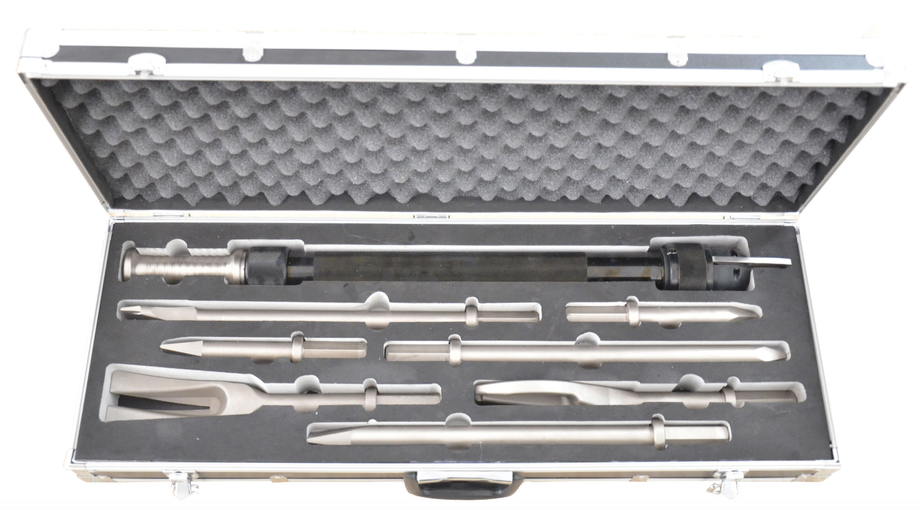 本套组配有冲击器、宽凿、尖凿、窄凿、短凿、切割器、拔钉器等工作头,共8件套。冲击器:冲击器长度:77.5cm 冲击器重量:5.5kg冲击行程: 442mm; 460mm长凿、230mm短凿,460mm*68mm长宽凿,460*36mm长窄凿、230*36mm长短凿,460*66mm起钉器,460*70mmmm切割头组成。质量:14Kg标配铝合金防水箱体。外包装尺寸:83*30*13cm